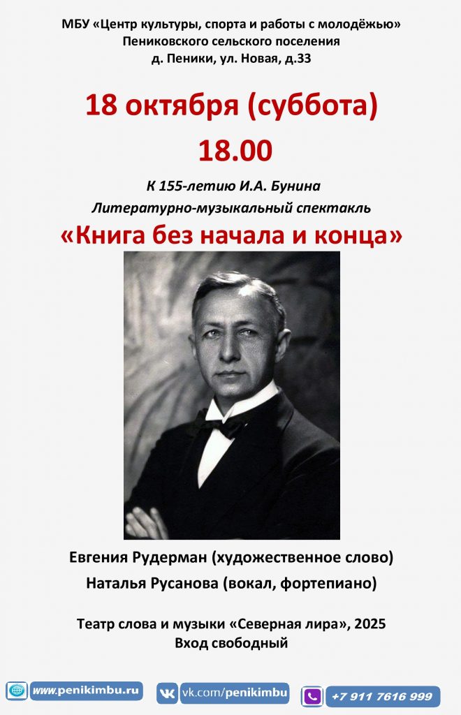 Литературно-музыкальный спектакль «Книга без начала и конца» посвящён жизни и творчеству Ивана Алексеевича Бунина.