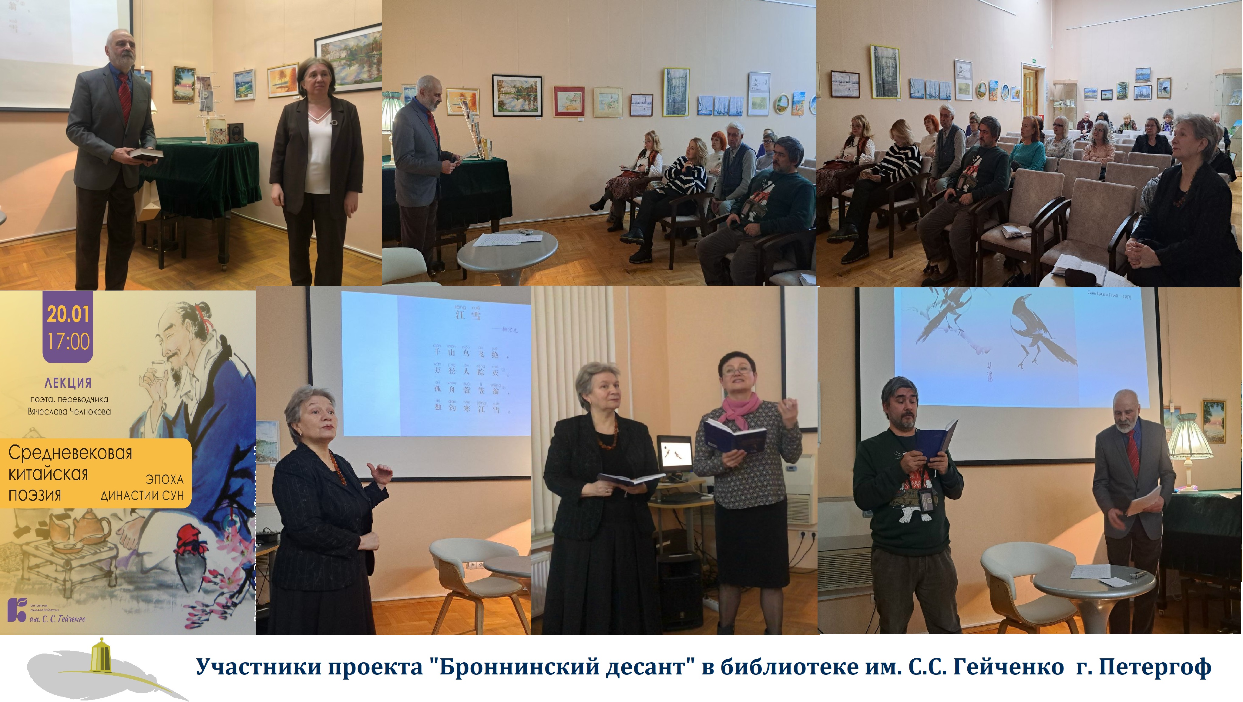 Уже в январе 2026 года участники проекта «Броннинский десант» — Вячеслав Челноков, Любовь Викторовна Иванова, Елена Буланенкова и Виктор Царёв — выступили на площадке Библиотеки им. С.С. Гейченоко г. Петергофа (Библиотека Петергофа), представив читателям мир китайской поэзии эпохи династии Сун.